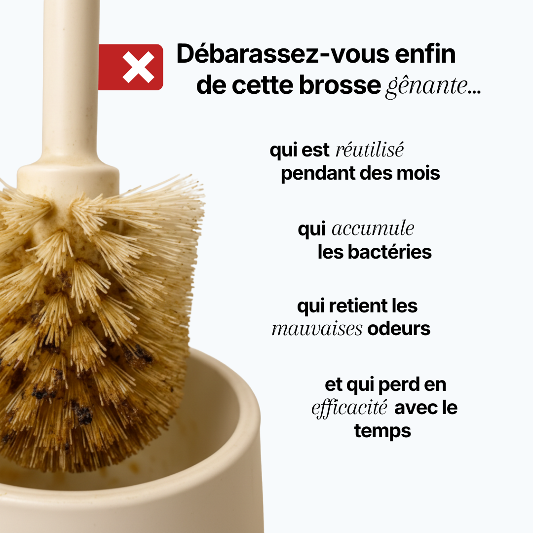Vous passez d'une brosse WC sale et malodorante à un nettoyage réellement hygiénique, propre et sans contact à chaque utilisation